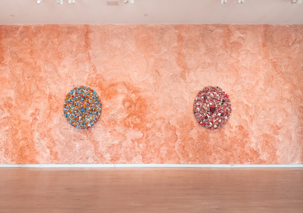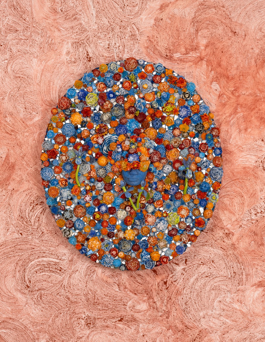 Bloom in hues of Orange, Blue, Red Posted on May 16, 2025September 6, 2025 by layobright Bloom in hues of Orange, Blue, Red 2024 Cast, blown, fused, mirrored glass and 23k gold leaf on custom frame 43 x 35 x 6 inches