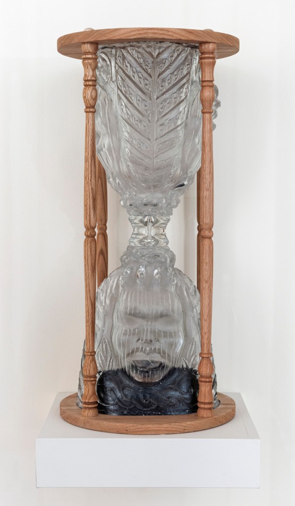 Mold-blown and blown glass, oak and measured black sand of approximately 9 minutes 29 seconds
