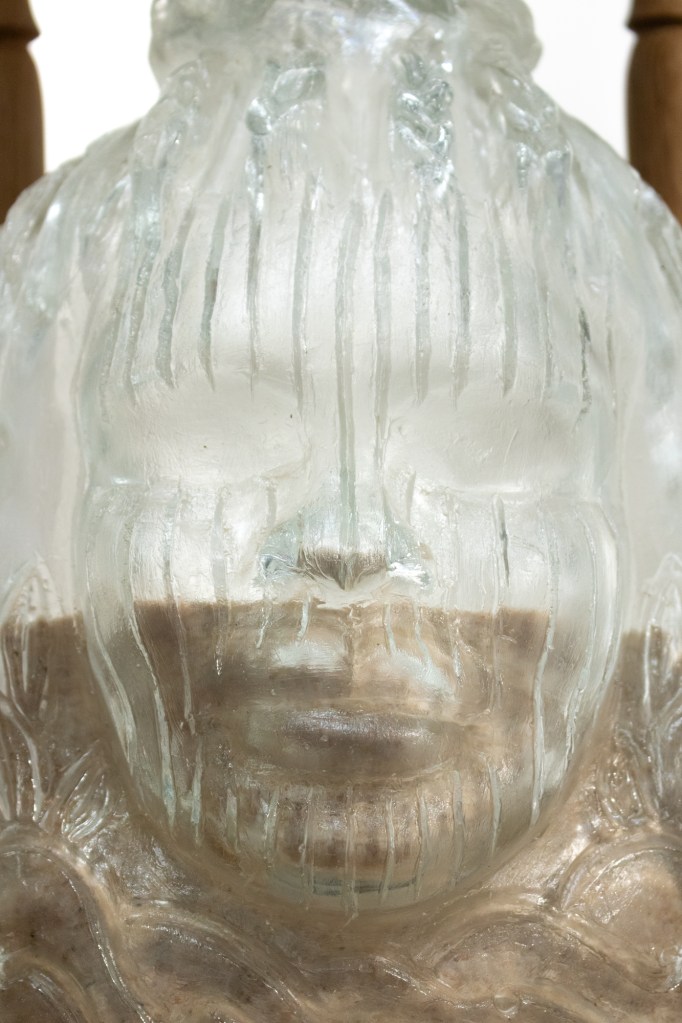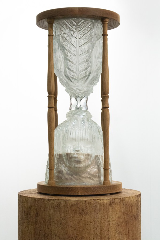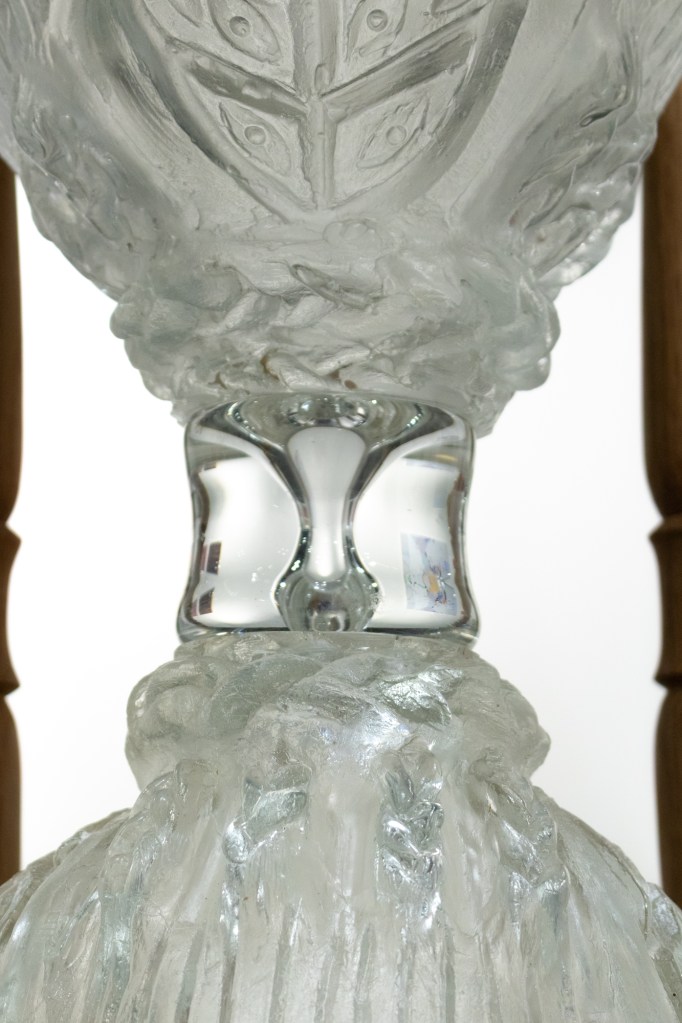 Mold blown glass, blown glass, timed natural sand (under 7 minutes), Quercus alba (white oak)