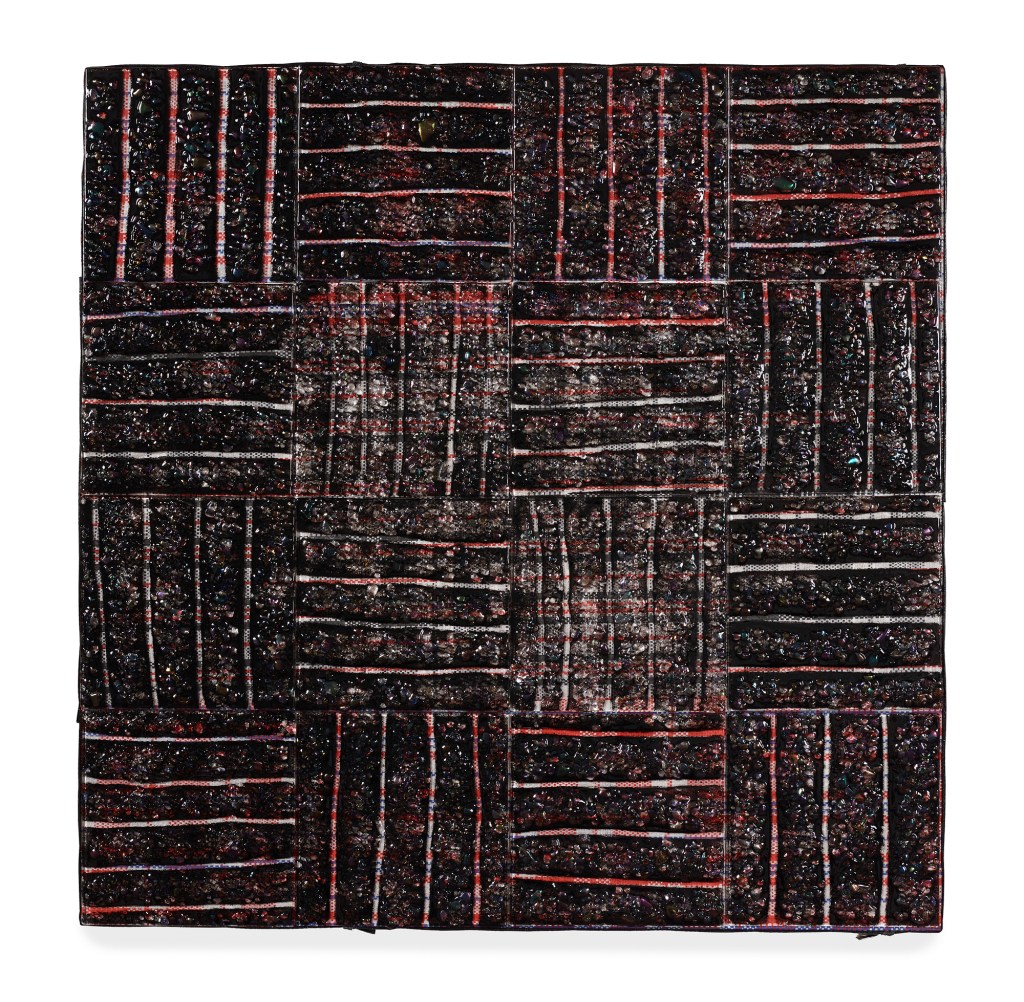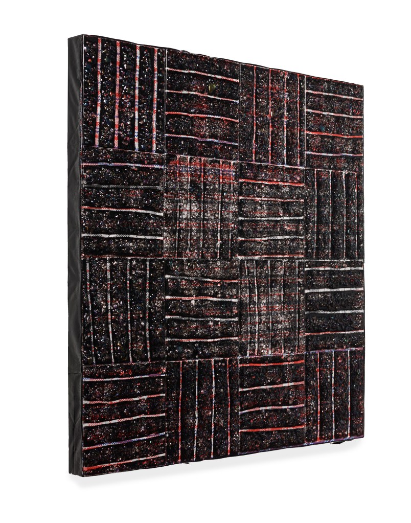 Marked [Rough Terrain] Posted on June 21, 2022June 21, 2022 by layobright Marked [Rough Terrain], 2022Fused Glass and Ghana-must-go bag on panel40 x 40 x 2 in